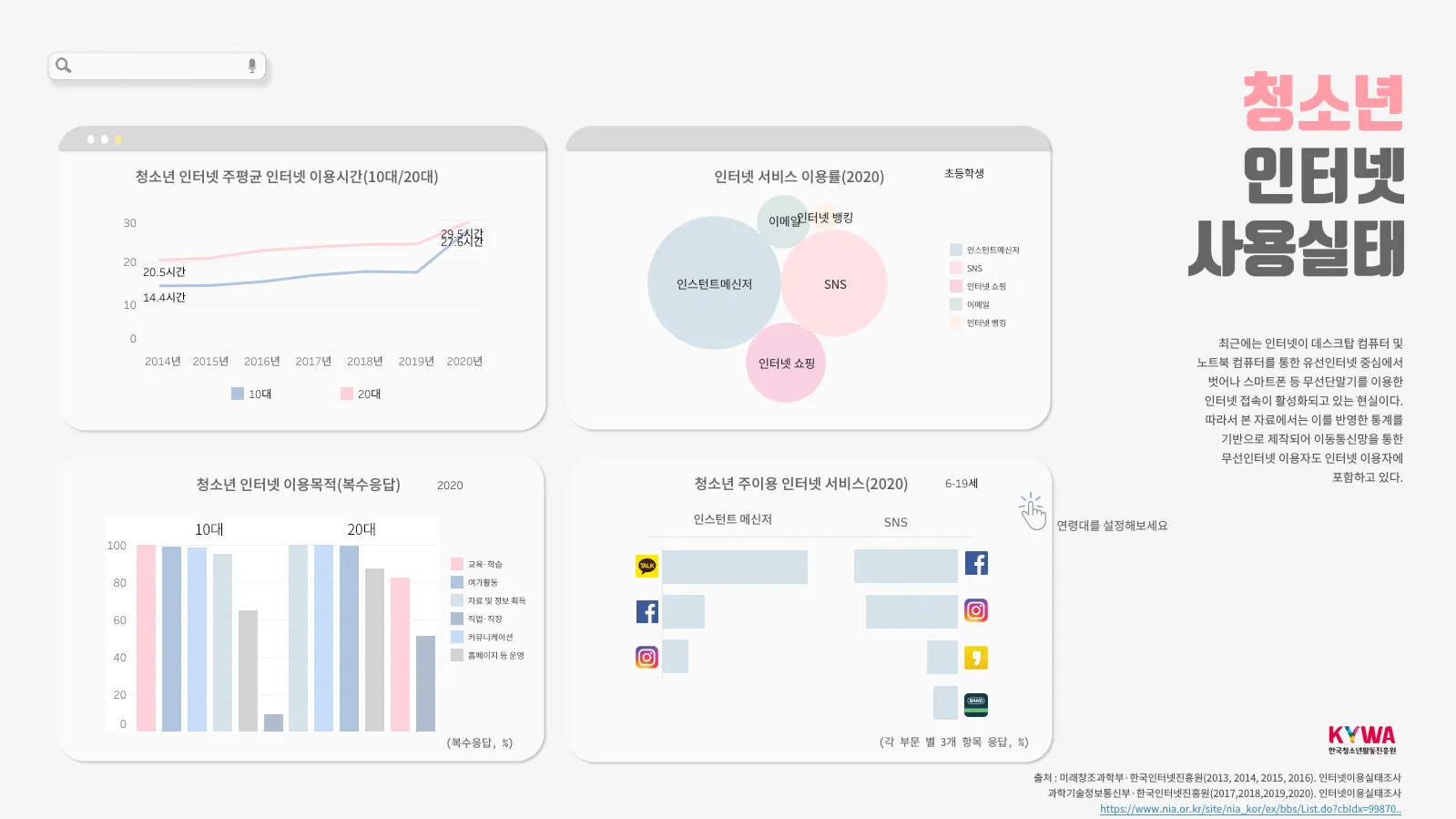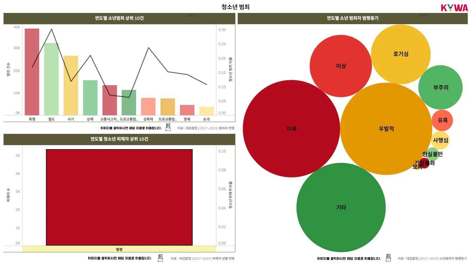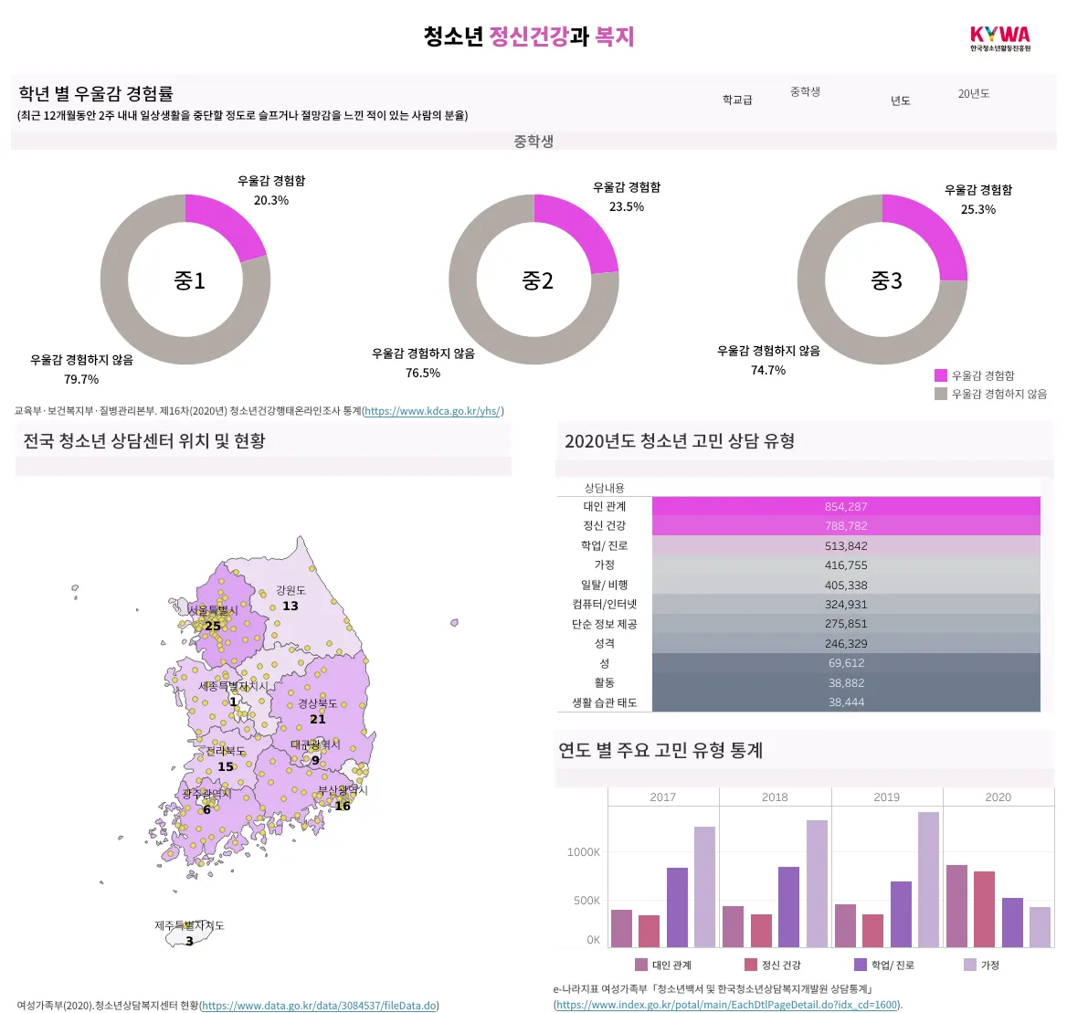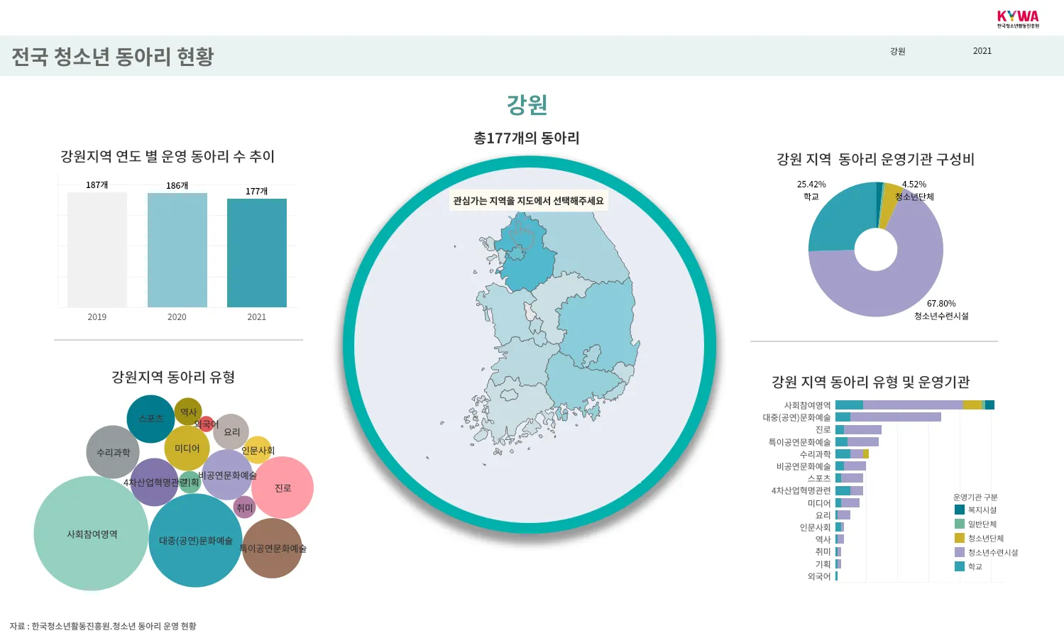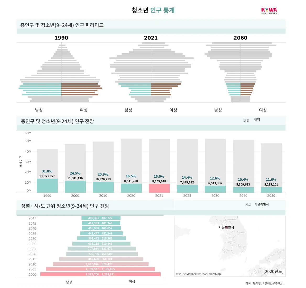 KYWA에서 제작한 데이터 시각화 및 대시보드를 통해 청소년의 동향을 살펴볼 수 있습니다.