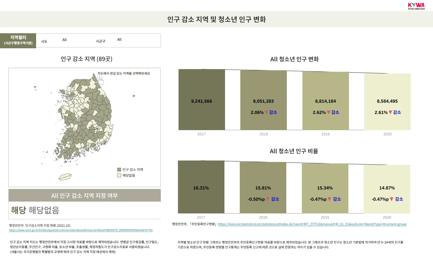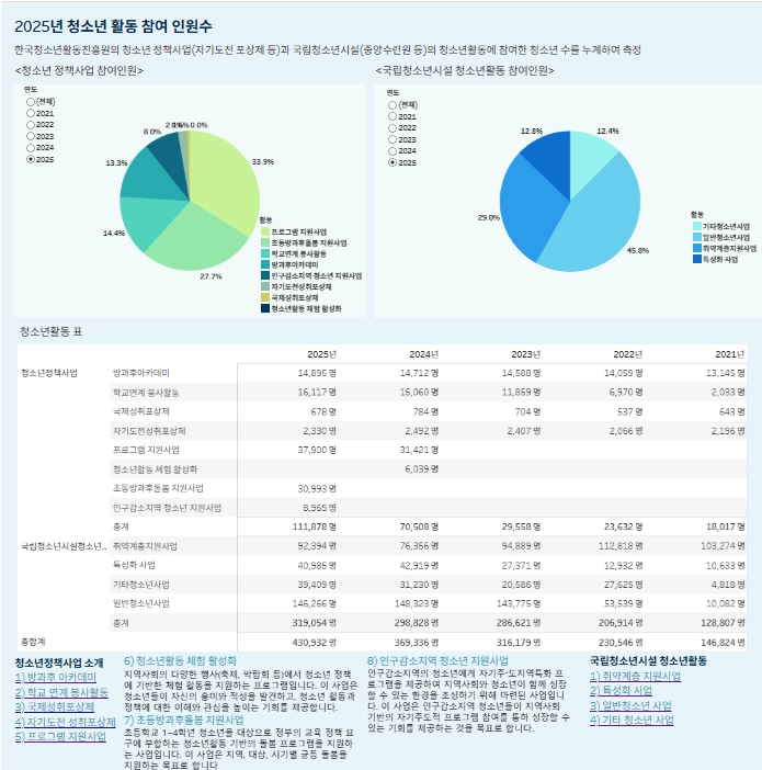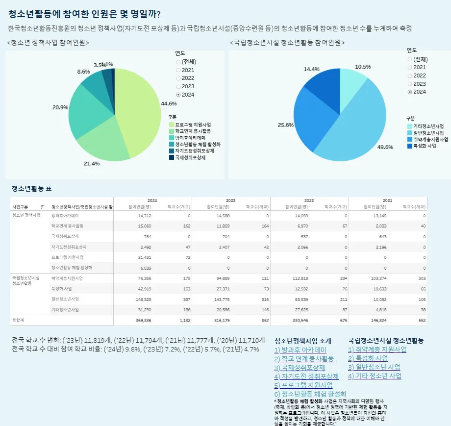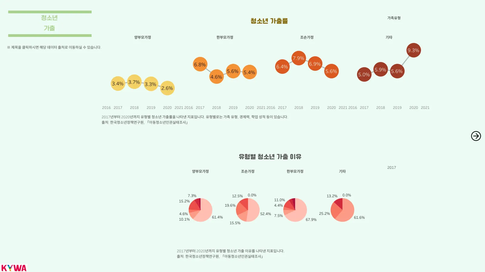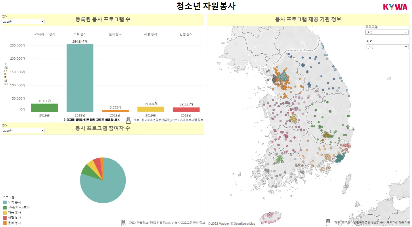 KYWA에서 제작한 데이터 시각화 및 대시보드를 통해 청소년의 동향을 살펴볼 수 있습니다.