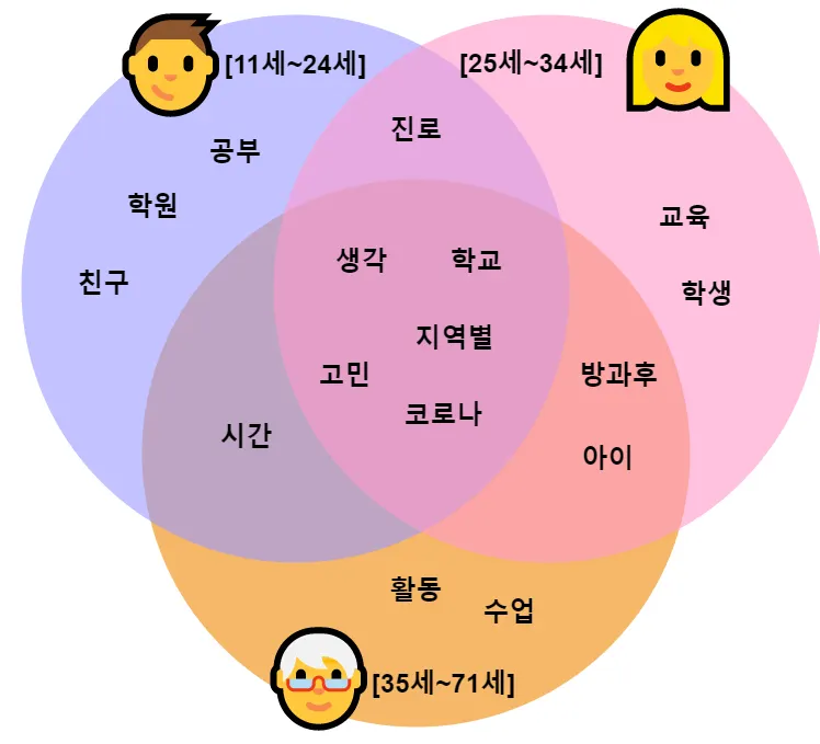 : κ° μΈλλ³μ λͺ©μ리λ₯Ό νμΈν΄λ³΄μλλ κ°κ° μ§μ€νκ³ μλ κ΄μ μ΄ λ€λ₯΄κΈ°λ νλ©΄μ κ°κΈ°λ ν κ² κ°μμ. 11μΈ~24μΈ "곡λΆ","νμ","μΉκ΅¬"..