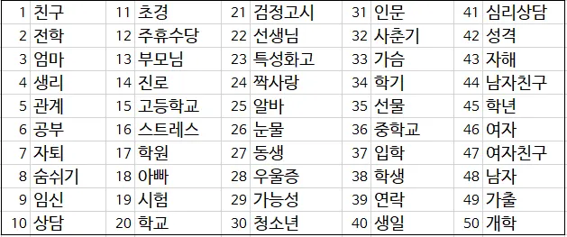 '์ ํ', '๊ณต๋ถ', '์ํด', '์ง๋ก', 'ํ๊ต', 'ํ์', '์ํ' ๋ฑ ํ์