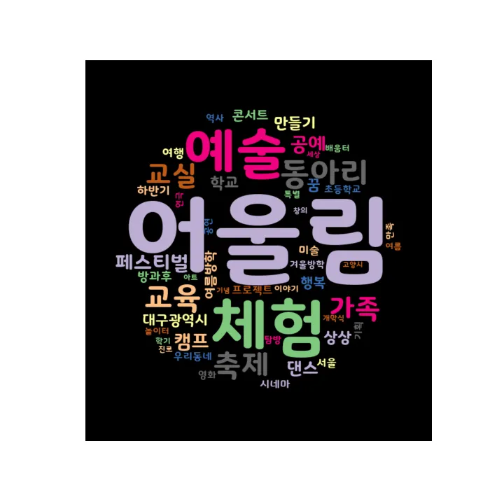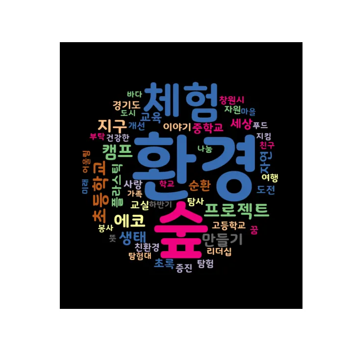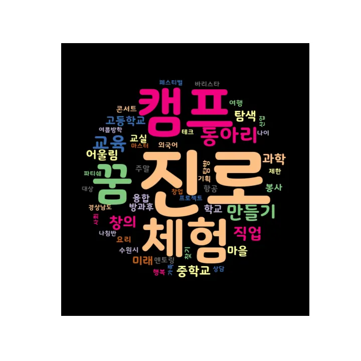 : 청소년프로그램에 사용되는 단어들은 선하고 예쁜 단어가 많은 것 같아요. 마음이 따뜻해집니다. 도전, 꿈, 상상, 행복, 탐험, 자연, 성취, 사랑. 같은거요. 우리가 하는 일이 '선한 일'임을 증명하는 것이 아닐까? 자긍심을 높이는 생각도 해봅니다. 한편, 아쉬움도 있습니다. 각 시설에서 운영되는 모든 청소년활동이 e청소년에 등록돼있다면 데이터 분석 결과 중 '캠프' 키워드가 유난히 더 보이진 않았을텐데 말이에요.(캠프 키워드가 많은 이유는 e청소년에 등록하는 프로그램들은 모집홍보 목적이 많아서 그렇겠죠?) 선배님들! 다른 지도자가 기획하고 운영하는 프로그램들, 타 지역, 기관의 프로그램들. 모두 알고 싶지 않으세요? 어떻게 하면 좋을까요? 좋은 의견이 있으시면 부탁드려요!!
