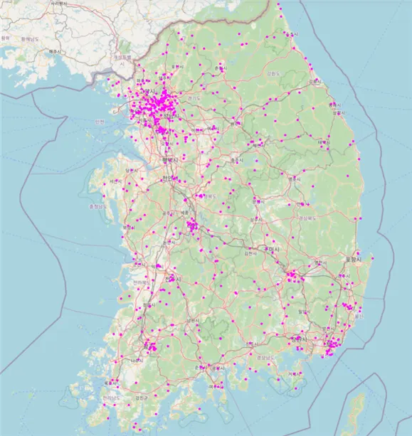 2019년에도 활동됐던 프로그램 장소의 위, 경도 데이터를 추출했고요. 그 데이터를 활용해서 “2019년 청소년활동 지도”를 만들어보았어요. 도심 중심, 해안가 중심으로 청소년 활동이 몰려있다는 것을 확인할 수 있었답니다.