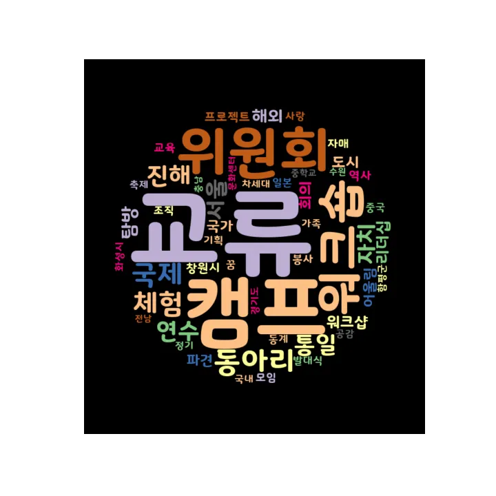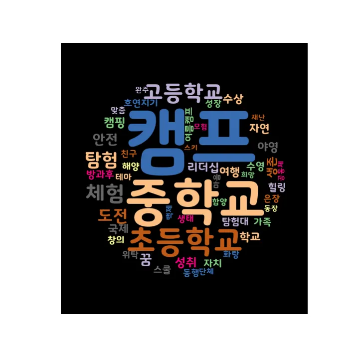 : 분야별로 키워드를 보니 어떤 주제에 집중하고 있는지 확인할 수 있었어요. 그런데 의문점! 봉사협력을 제외하고 모든 분야에서 “캠프”, “체험” 단어들이 등장하고 있어요. “캠프”, “체험”.. 너란 키워드.. 청소년활동의 정체성 그 자체?