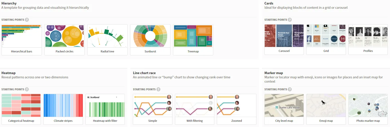 무료 플랫폼으로, 구글계정으로 로그인하면 차트 시각화, 지도 시각화, 애니메이션, 반응형 시각화 등 다양한 시각화기법을 이용할 수 있습니다.