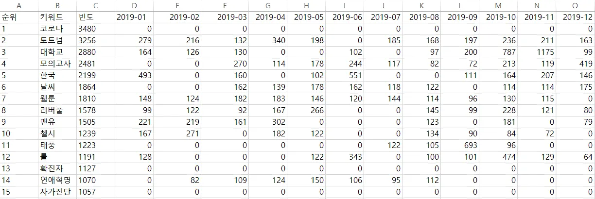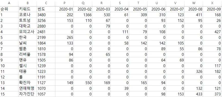 2-2. 전체 상위 15개의 키워드의 시간 변화에 따른 출현빈도를 파악하기 위해 2019년 1월부터 2020년 9월까지 시계열 형태로 구성해보았습니다. (A ~ X열)