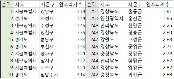 인프라지수 상,하위 10개 지역